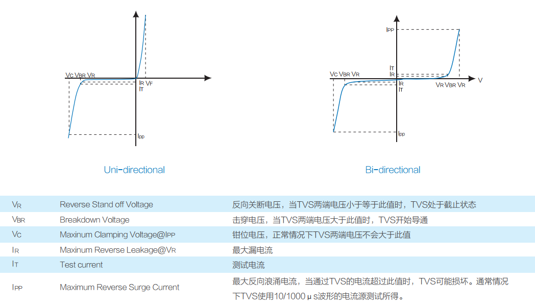 From the above TVS characteristic parameters, it can be inferred that TVS has three voltage parameters: VR, VBR, and VC, as well as three current parameters: IR, IT, and IPP.