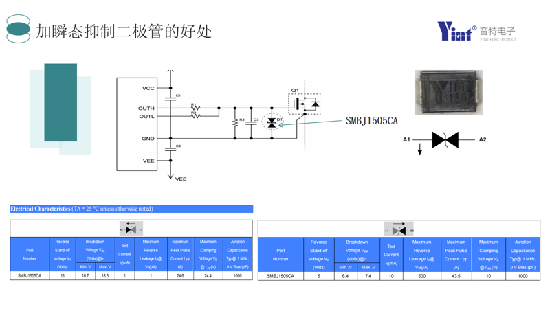 The transient suppression diode can respond quickly to the occurrence of overvoltage, limiting it to a safe range, providing reliable protection for the SIC MOSFET gate, and ensuring the device operates normally in harsh electrical environments