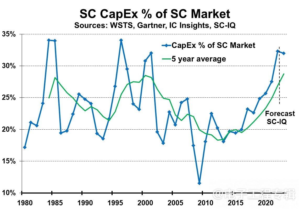From 1980 to present, the average percentage of semiconductor capital expenditure in the semiconductor market has been 23%, ranging from 12% to 34% on an annual basis, and from 18% to 29% on a five-year average basis.