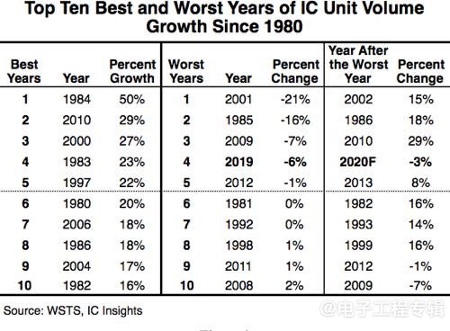 IC Insights data also shows that before 2019, there were four years in which IC shipments declined: 1985, 2001, 2009, and 2012. Among the four declines in IC unit shipments before 2019, two (1985 and 2001) occurred immediately after years of significant growth in IC shipments (followed by a decrease in shipments due to high inventory levels) - in 1984 and 2000, IC unit shipments showed high growth rates of 50% and 27%, respectively.