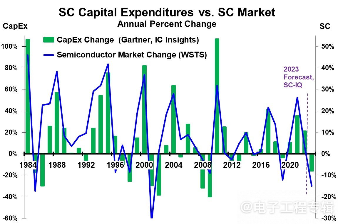 So there is a cycle in the semiconductor market, which exacerbates market volatility. In prosperous years, semiconductor companies, especially giants, will increase their capital expenditures to expand production capacity. In depressed years, they will correspondingly reduce capital expenditures, leading to IC overcapacity and product price declines after the prosperous period, exacerbating the market downturn.