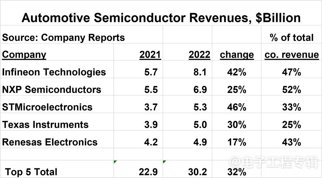 Infineon, NXP, STMicroelectronics, Texas Instruments, and Renesas are the top 5 automotive semiconductor suppliers in sequence. In 2022, Infineon Automotive Semiconductor ranked first with a revenue of $8.1 billion, and its automotive business accounted for 47% of the company's total revenue; Renesas Electronics' automotive business revenue has increased from 17% to 43%, while NXP's automotive business accounts for 52% of total revenue.