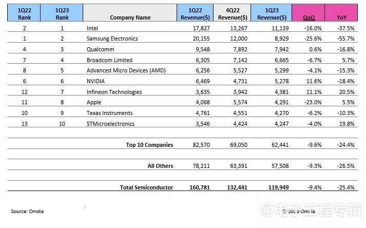 Omdia's latest research shows that in the semiconductor revenue of Q1 2023, Samsung was replaced by Intel and dropped to second place in the semiconductor sales ranking. In the quarter, Samsung fell 55.7% year-on-year, with revenue of $8.929 billion; Intel's revenue was $11.149 billion, a year-on-year decrease of 37.5%.
