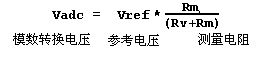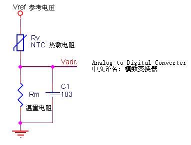 如上图所示 NTC 热敏电阻 Rv 和测量电阻 Rm(精密电阻)组成一个简单的串联分压电路,参考电压VCC_Ref 经过分压可以得到一个电压值随着温度值变化而变化的数值,这个电压的大小将反映出NTC 电阻的大小,从而也就是相应温度值的反映。 通过欧姆定律可以得到输出电压值 Vadc 和 NTC 电阻值的一个关系