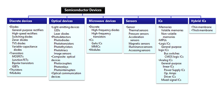 随着应用领域的扩大和电子设备的发展,各种半导体器件得到了不断开发。“分立半导体”是指具有单一功能的单个器件,比如晶体管和二极管。“集成电路(IC)”是指在一个芯片上安装有多个功能元件的器件。典型IC包括存储器、微处理器(MPU)和逻辑IC。LSI则提高了IC的集成度。按一般功能/结构,具体分类如下所示。
