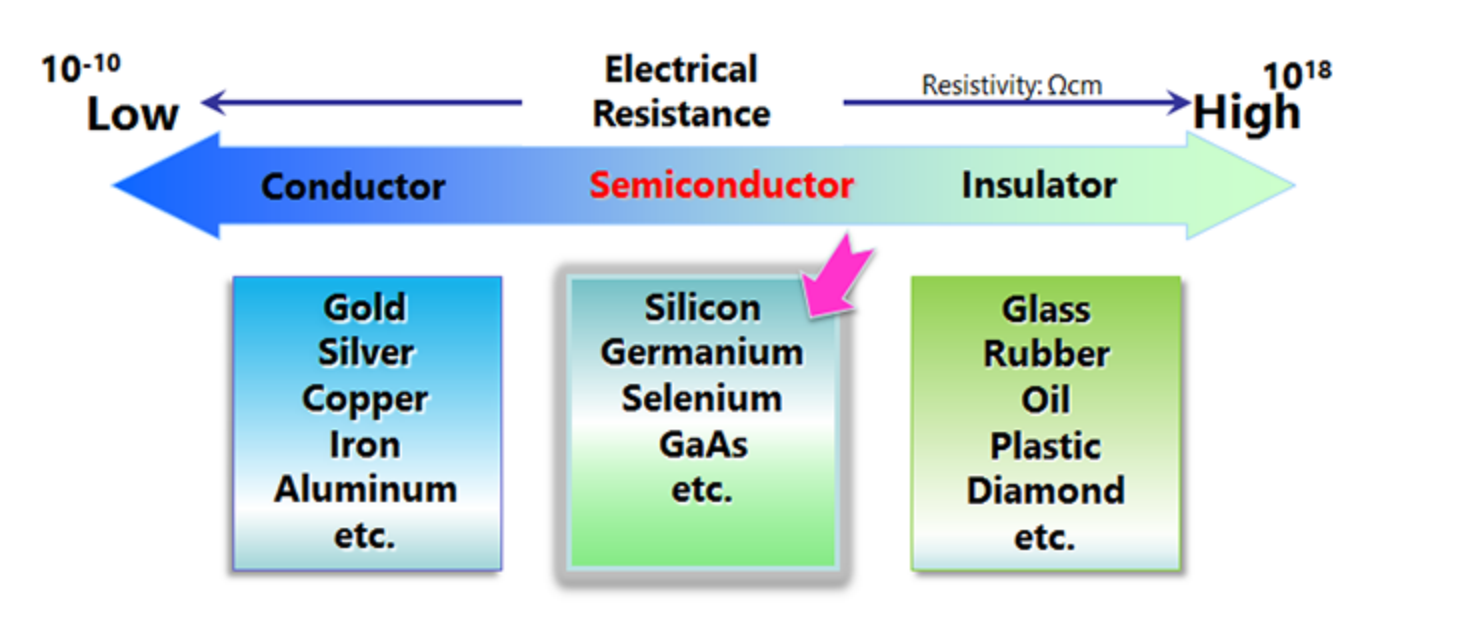 “半导体”是一种特性介于“导体”和“绝缘体”之间的物质,前者像金属一样导电,后者几乎不导电。电流流动的容易程度与物质电阻的大小有关。如果电阻高,电流很难流动;如果电阻低,电流容易流动。