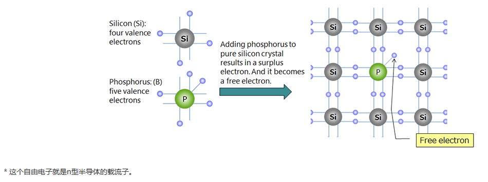 n型半导体是指以磷(P)、砷(As)或锑(Sb)作为杂质进行掺杂的本征半导体。第IV组的硅有四个价电子,第V组的磷有五个价电子。如果在纯硅晶体中加入少量磷,磷的一个价电子就可以作为剩余电子自由移动(自由电子*)。当这个自由电子被吸引到“+”电极上并移动时,就产生了电流流动。