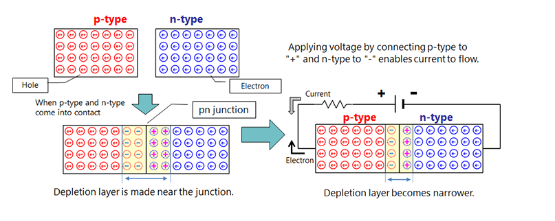 p型和n型半导体键合时,作为载流子的空穴和自由电子相互吸引、束缚并在边界附近消失。由于在这个区域没有载流子,所以它被称为耗尽层,与绝缘体的状态相同。