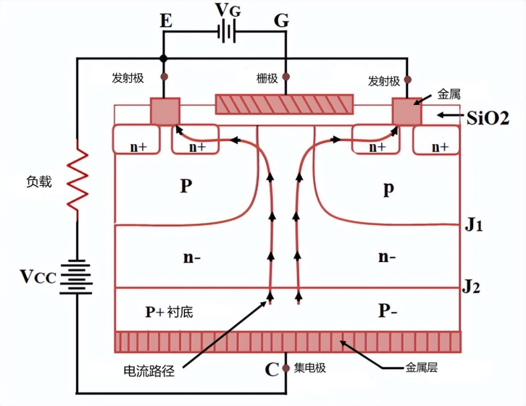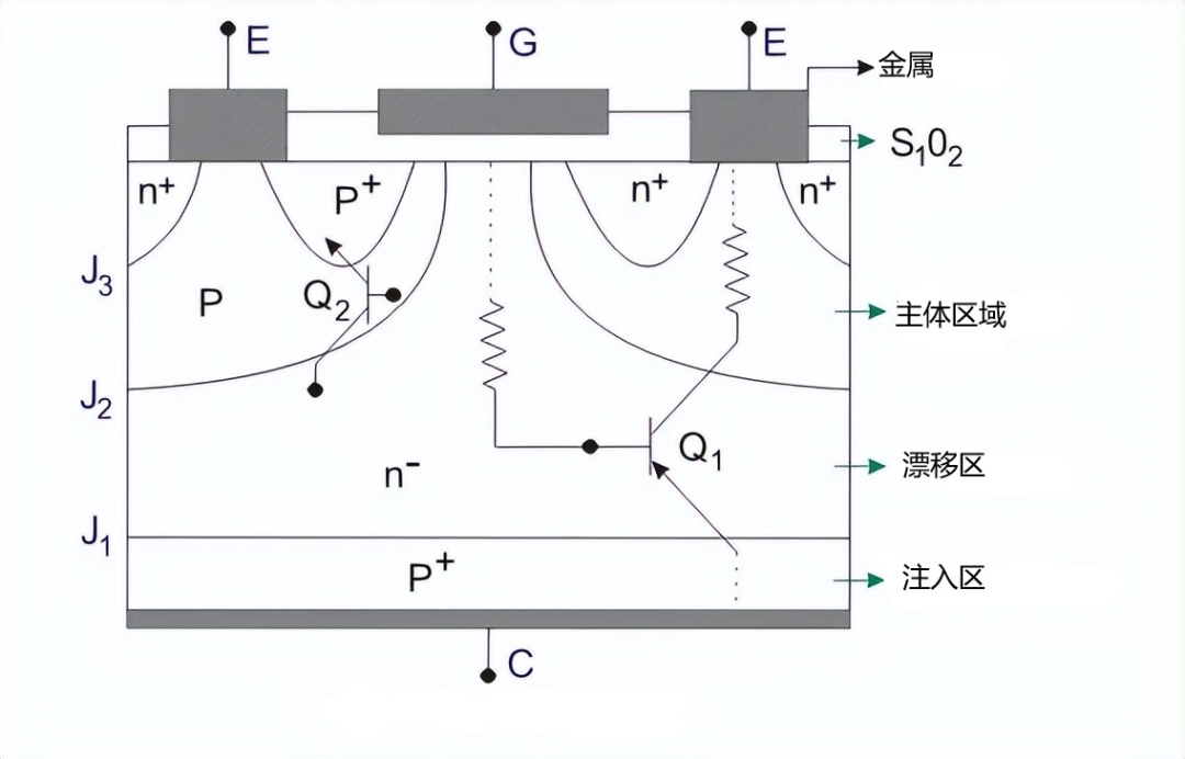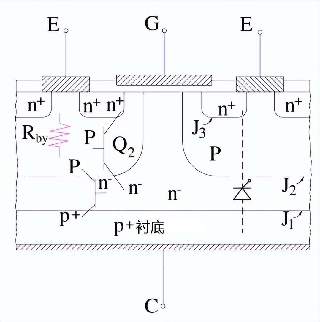 仔细检查 IGBT 的基本结构,可以得出这个等效电路,基本结构如下图所示。