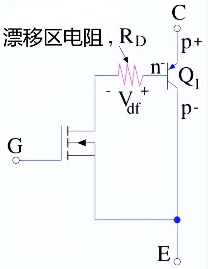 众所周知,IGBT是 MOS 管的输入和 BJT 的输出的组合,它具有与N沟道MOS管和达林顿配置的PNP BJT等效的结构,因此也可以加入漂移区的电阻。