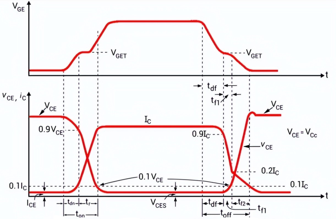 延迟时间 (t dn ):定义为集电极电流从漏电流 ICE上升到 0.1 IC(最终集电极电流)和集电极发射极电压从 VCE下降到 0.9VCE的时间。