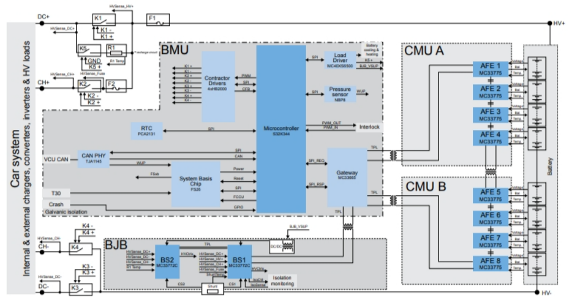 BMS由电池管理单元(BMU)、电池监测单元(CMU)和电池接线盒(BJB)3个模块组成,如何在作为系统大脑的BMU、CMU和BJB子系统之间建立BMS内部通信也需要设计人员在选择方案时做出仔细评估。