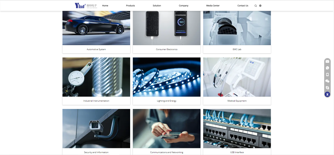 The website has undergone a complete restructuring of its structured content, dividing the main navigation bar into six sections: "Home", "Products", "Solutions", "Company", "Media Center", and "Contact Us". In terms of layout, each section has clear functions and highlights key points, presenting a more comprehensive display of Yinte Electronics' brand, products, technology, services, and other comprehensive strengths, facilitating users to obtain company product and service information more quickly.