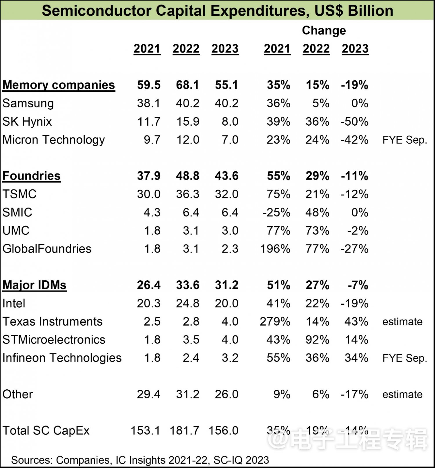 In recent years, the PC and smartphone markets have remained sluggish without any signs of improvement, and the storage industry has been severely affected. In addition to significant spending cuts by storage companies, contract manufacturers will also reduce capital expenditures by 11% in 2023, TSMC by 12%, UMC by 2%, and Gexin by 27%. IDM manufacturers have reduced their capital expenditures by 7%, with Intel planning to cut by 19%. Texas Instruments, STMicroelectronics, and Infineon have risen to the challenge and increased their capital expenditures in 2023, with the automotive and industrial related markets making the main contribution.