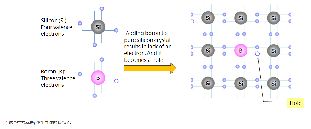 p型半导体是指掺杂了硼(B)或铟(In)的本征半导体。第IV组的硅有四个价电子,第III组的硼有三个价电子。如果将少量硼掺杂到硅单晶中,在某个位置上的价电子将不足以使硅和硼键合,从而产生了缺少电子的空穴*。在这种状态下施加电压时,相邻的电子移动到空穴中,使得电子所在的地方变成一个新的空穴,这些空穴看起来就像按顺序移动到“–”电极一样。